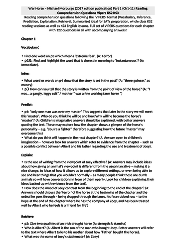 War Horse Michael Morpurgo Reading Comprehension Ch1 11 122 Vipers Sats Style Questions Teaching Resources
